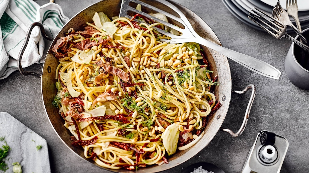 Mediterranes Spaghetti-Gericht mit Fenchel und getrockneten Tomaten.