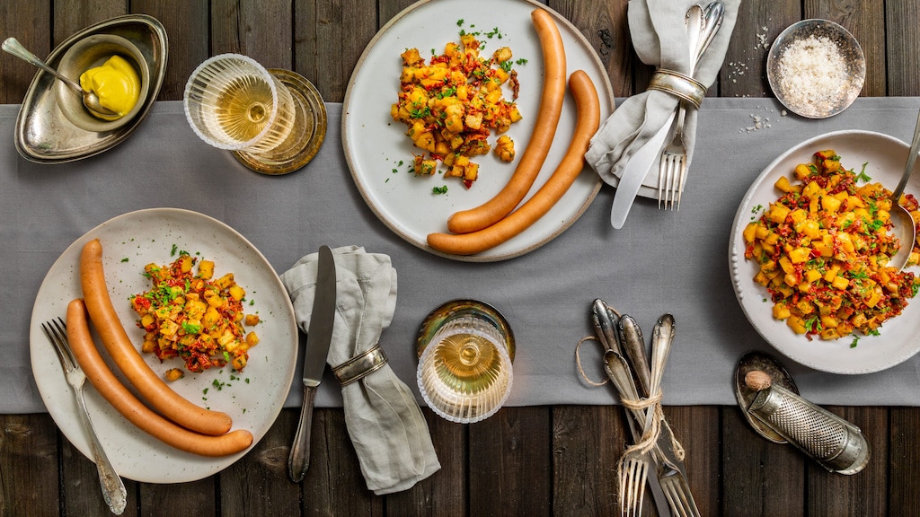 Für jede Party eine Bereicherung: Probieren Sie unser Rezept für einen festlichen Kartoffelsalat. Passend mit Wiener Würstchen und getrockneten Tomaten im Senf-Dressing.