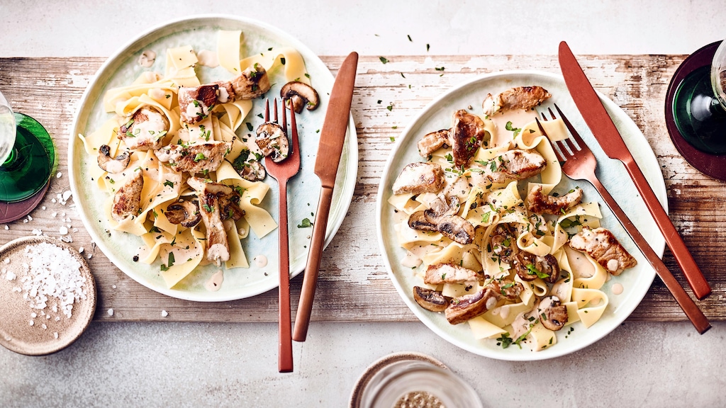 Schnell zuzubereiten und leicht vorzubereiten: Unser Filettopf-Rezept sollten Sie sich auf Ihre Liste praktischer und leckerer Alltagsrezepte schreiben! In einer guten halben Stunde zaubern Sie ein feines Gericht, das mit zwei verschiedenen Pilzsorten, Fleisch aus dem Filet vom Schwein, Crème fraîche und einem Schuss Weißwein durchaus auch sonntagstauglich wäre! Das Rezept für den Schweinefilettopf lässt sich zudem wunderbar bereits am Vortag vorbereiten: Kochen Sie am nächsten Mittag nur noch die Bandnudeln frisch und erwärmen Sie den Filettopf mit Pilzen im Ofen oder im Topf auf dem Herd – so müssen Sie auch trotz Berufstätigkeit nicht auf ein super Mittagessen verzichten. Ein weiteres Gericht aus dieser Kategorie gelingt Ihnen mit unserem Rezept für Lendentopf: Auch diesen Auflauf können Sie wie unser Filettopf-Rezept gut vorbereiten und müssen ihn am nächsten Tag nur noch im Ofen fertig garen.Und für Nudelfans empfehlen wir unsere so einfachen wie leckeren Bandnudel-Rezepte!