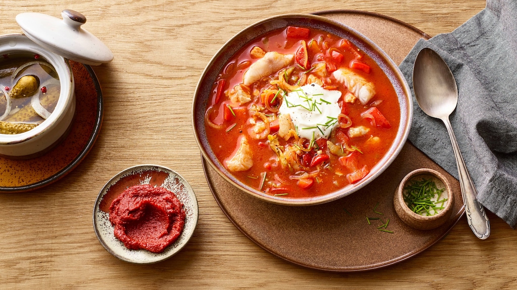 Die Soljanka – eine deftige, reichhaltige Suppe – trat von Russland aus einen kulinarischen Siegeszug durch ganz Osteuropa an und steht heute in verschiedensten Spielarten auf den Tischen. Sie lässt sich mit wenigen Zutaten schnell und einfach zubereiten, ob mit Fleisch, Wurst oder Fisch. Für unser Fischsoljanka-Rezept kommt Dorschfilet zum Einsatz, Sie können die Fischsuppe aber auch mit anderen grätenfreien Filets kochen. Seelachs, Karpfen, Hecht, Zander oder Forelle funktionieren genauso gut. Oder Sie entscheiden sich für eine Mischung und genießen verschiedene Fischaromen.