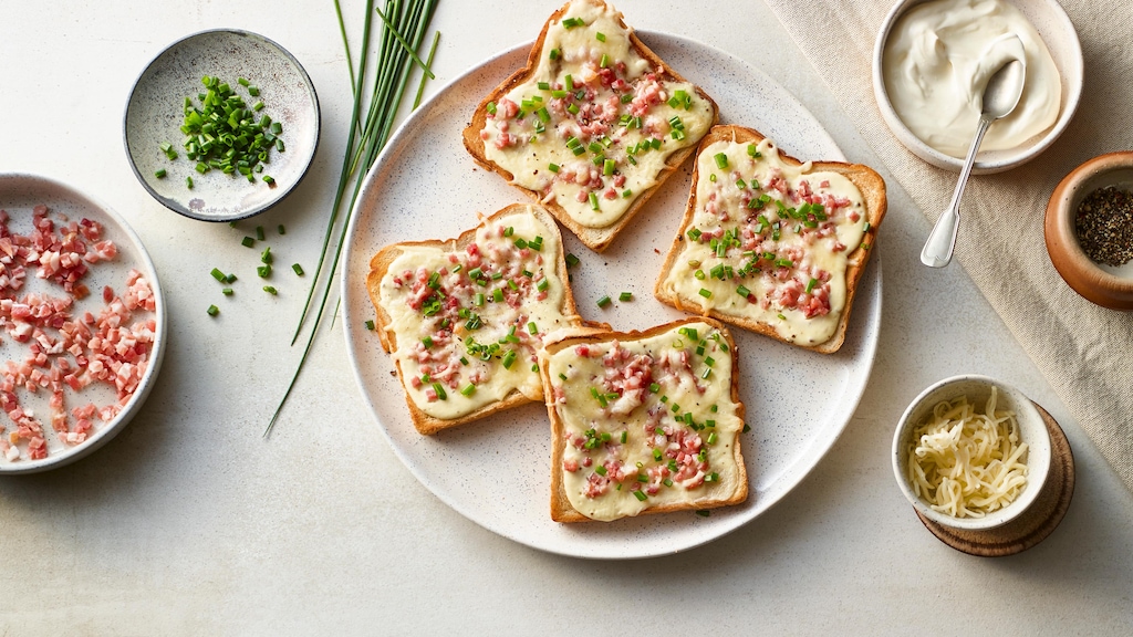 Der Belag besteht bei unserem Flammkuchen-Toast-Rezept ganz klassisch aus Crème fraîche, Sauerrahm, Schinkenspeck, Emmentaler und Schnittlauch – fast wie beim berühmten Elsässer Flammkuchen. Fügen Sie gerne noch rote Zwiebeln hinzu, wenn Sie sich dem Original noch mehr annähern möchten. Sie können aber auch jede andere Auflage wählen. Statt mit Sauerrahm und Crème fraîche schmeckt der Flammkuchen-Toast auch mit Quark oder Frischkäse als Basis – am besten mit ganz viel frischen Kräutern verfeinert. Der Speck lässt sich durch gekochten Schinken ersetzen und der geriebene Emmentaler durch jede andere Hartkäsesorte. Auch ganz andere Geschmacksrichtungen sind natürlich möglich. Gestalten Sie Ihr eigenes Rezept für Flammkuchen-Toast mit
