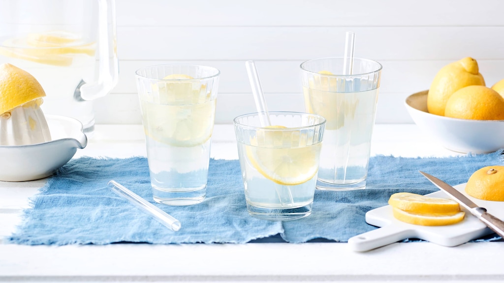 Dieses Kaltgetränk für heiße Tage ist vegan und besteht nur aus drei Zutaten: Probieren Sie unsere Limonade aus frischen Zitronen, Puderzucker und stillem Mineralwasser – in 20 Minuten zubereitet!