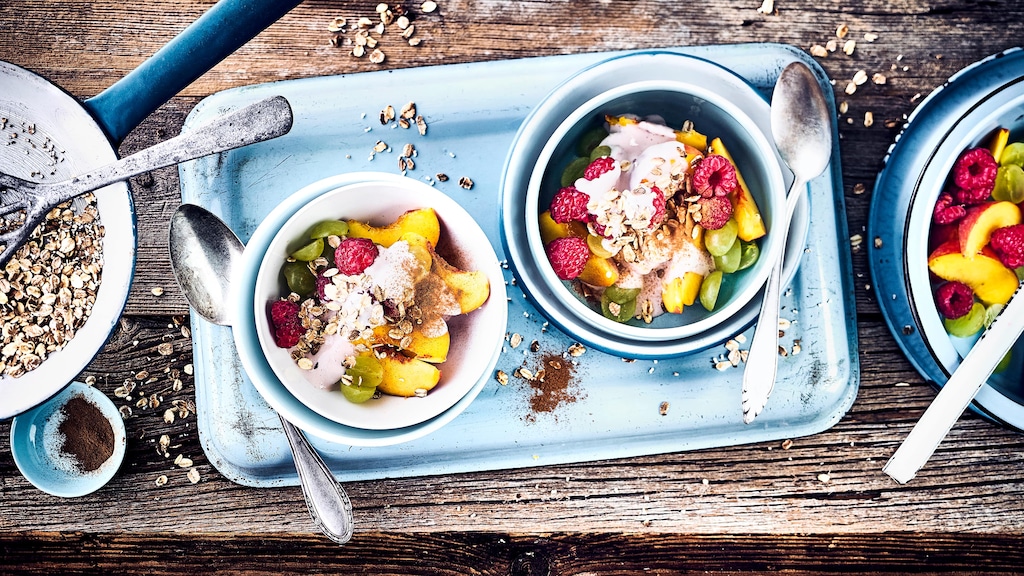 Ideal zum Frühstück oder als Dessert: Unser frischer Fruchtsalat mit feiner Beerenquarkcreme und Knusperflocken – fertig in nur zehn Minuten!