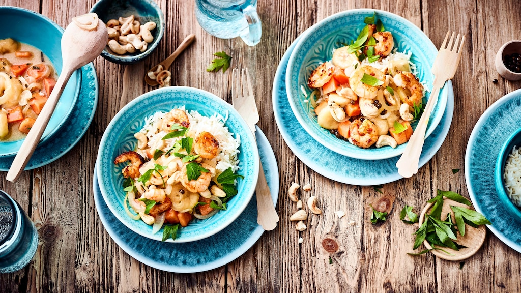 Garnelen mal anders und zwar fruchtig – an Kokosmilch, Banane und Papaya. Dazu passt Basmati-Reis.
