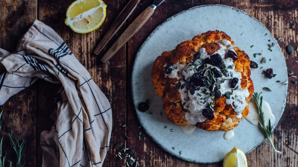 Genießen Sie die heimische Kohlart in Kombination mit orientalischen Gewürzen: Nach unserem Rezept wird Blumenkohl mit Chili, Paprika und Zitronensaft mariniert, im Ofen gebacken und mit einer Soße aus Tahin, Knoblauch und Ingwer serviert.