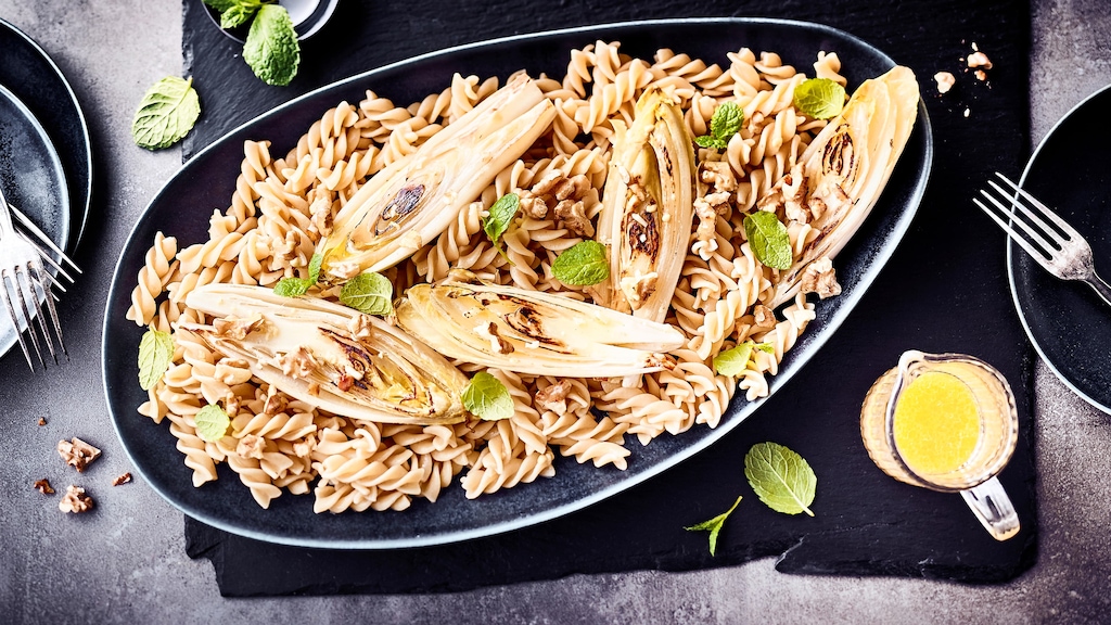 Gebratener Chicorée nach Belieben mit warmer oder kalter Pasta, Vinaigrette und gerösteten Walnüssen anrichten. Mit frisch gehackter Minze garnieren und servieren.