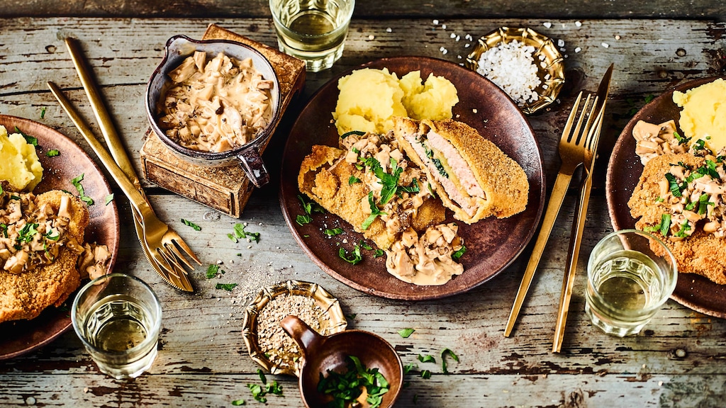 Gefüllte Jägerschnitzel mit Pilzsauce und Kartoffelpüree servieren.