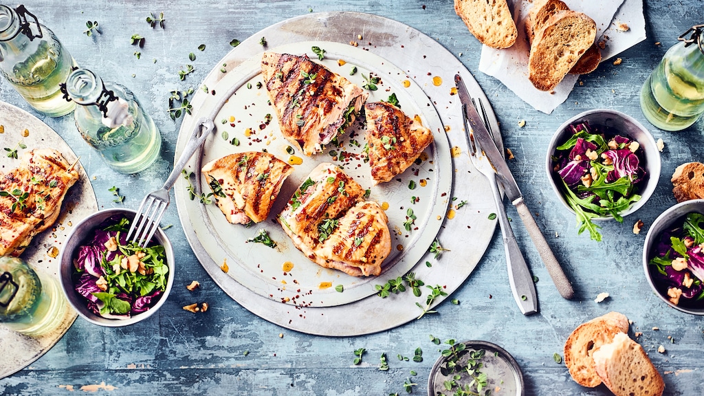 Anschließend auf dem Grill von jeder Seite 4–6 Minuten sanft grillen. Danach 2 Minuten ruhen lassen. Dazu passen geröstetes Brot und Radicchio-Salat.