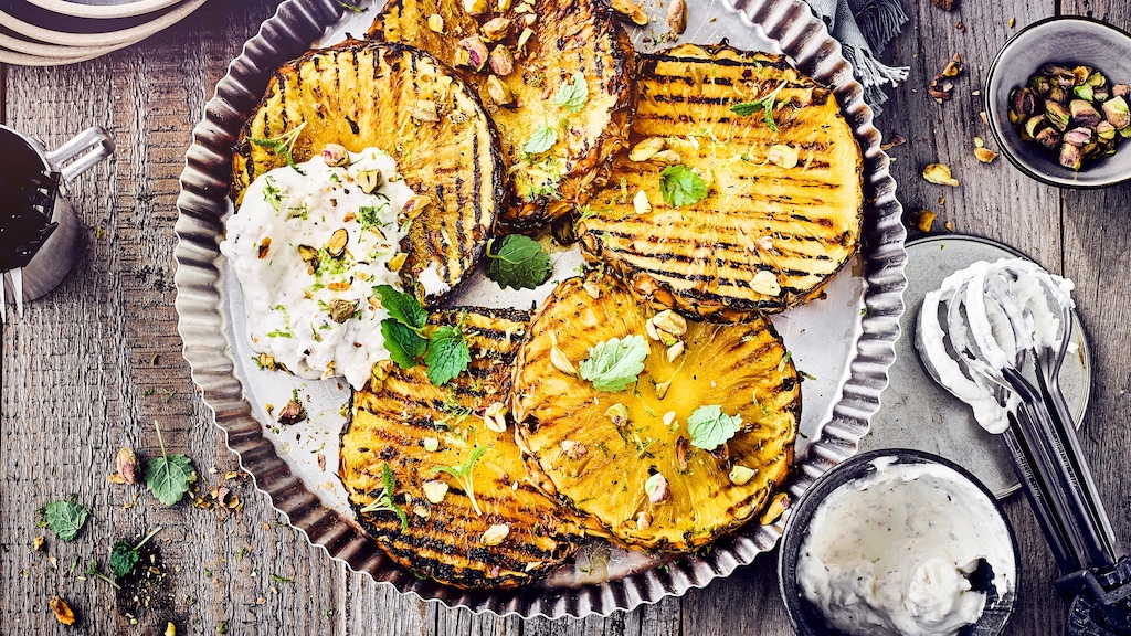 Sicherlich bereichert auch die eine oder andere Kugel Vanilleeis unsere gegrillten Ananasscheiben. Nötig sind sie jedoch nicht. Schließlich vertragen sich Ananas und Kokos noch ein Stück besser. Erst recht, da Sie für unser Rezept tatsächlich eine frische Kokosnuss verwenden und sie ebenfalls grillen. Danach verarbeiten Sie alles im Mixer zu feinem Püree und machen sie so zur zentralen Zutat der Sahne-Kokos-Creme zu unserer gegrillten Ananas. Eine unglaublich leckere Kombination, die neben Pistazien und Minze auch einen Klecks Honig bereitwillig aufnimmt. Stellt die Ananas für Sie nur den Ausgangspunkt dar, um noch weiteres Obst zu grillen, können Sie sich als Beilage auch unseres Rezepts für gegrillte Feigen annehmen. Auch bei mittlerer Hitze gegrillte Pfirsiche sind eine Option. Und Heidelbeeren, Himbeeren und Brombeeren kommen bei unserem Rezept für Blätterteigtaschen mit Beeren vom Grill erfolgreich zum Einsatz! Spielt das Wetter dagegen mal nicht mit und Sie verlegen Ihren entspannten Abend nach drinnen, überraschen Sie Ihre Freunde wiederum mit unserem süßen Raclette. Tipp: Um festzustellen, ob eine Ananas reif ist, müssen Sie die Frucht nicht erst in Stücke schneiden. Aufschluss geben Blätter und Duft. Riecht sie intensiv fruchtig und sitzen die Blätter nicht mehr ganz fest, können Sie sie besten Gewissens zubereiten.