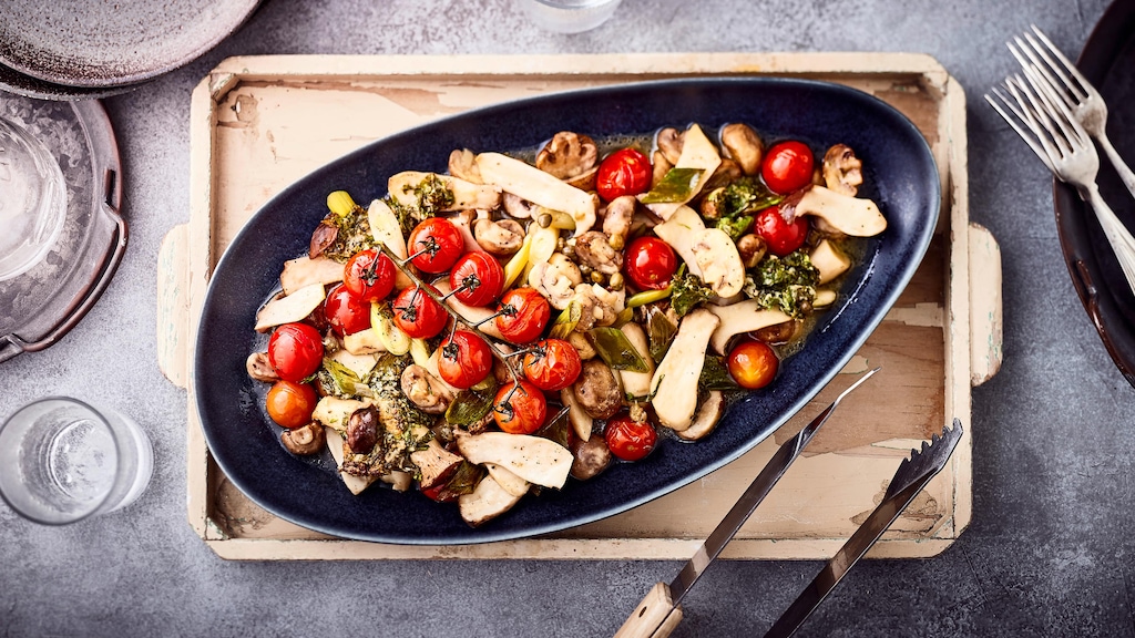 Eine raffinierte Vorspeise für anspruchsvolle Gäste: Gegrillte Antipasti mit Pilzen, Kirschtomaten und Kapern – super schnell zubereitet!