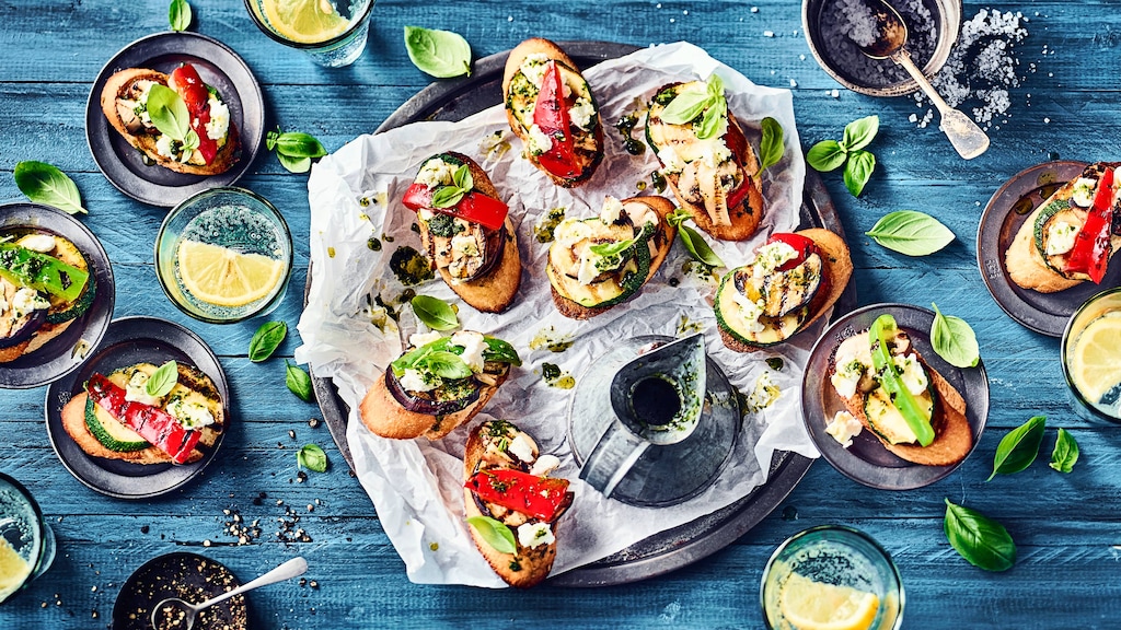 Schnelles Sommergericht: Probieren Sie unsere Bruschetta mit Ziegenfrischkäsetaler und gegrilltem Gemüse – vegetarisch und lecker!