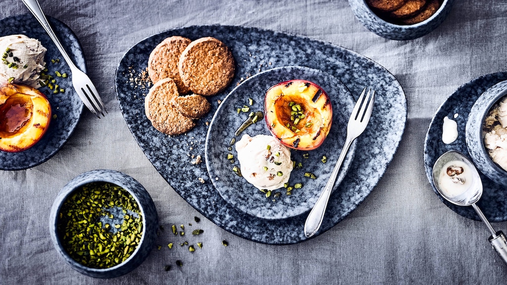 Raffiniertes Dessert vom Grill: Probieren Sie unser Rezept für gegrillte Nektarine mit Eis, gehackten Pistazien und Vollkornkeksen aus!