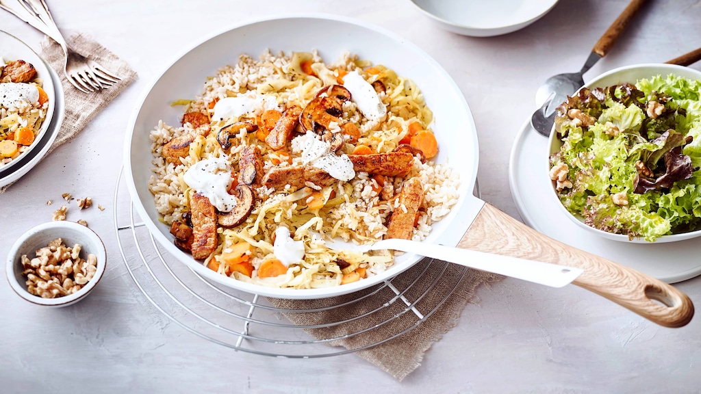 Mit unserem Rezept für eine Gemüsepfanne mit Fleisch liefern wir Ihnen eine tolle Kochidee für eine Mahlzeit zum Sattessen: Fenchel, Weißkohl und Champignons aus der Pfanne, mit Naturreis und Schweinefleisch zubereitet und anschließend mit Ziegenkäse veredelt, werden zusammen mit Blattsalat, der mit Walnüssen und Minze angerichtet wird, zu einem raffinierten Gericht. Mit unserer Gemüsepfanne mit Fleisch zaubern Sie energiebringende Kohlenhydrate, wertvolles Eiweiß und vitaminreiches Gemüse unkompliziert auf die Teller Ihrer Gäste. Tipp: Für eine vegetarische Variante können Sie statt Fleisch auch Soja-Streifen oder Soja-Filet-Stücke anbraten. Unsere vegane Gemüse-Paella, die völlig ohne tierische Zusätze auskommt, bietet ebenfalls eine tolle fleischlose Abwechslung für Ihren Speiseplan.
