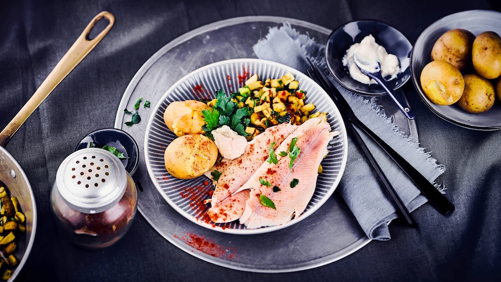 Geräuchertes Forellenfilet punktet mit einem milden Geschmack, ist praktisch grätenfrei und verzehrfertig. Ideal, um in nicht einmal einer halben Stunde eine leckere Fischmahlzeit zu genießen. Für unser Rezept kombinieren Sie geräucherte Forelle mit einer Pilzsalsa und Kartoffeln.