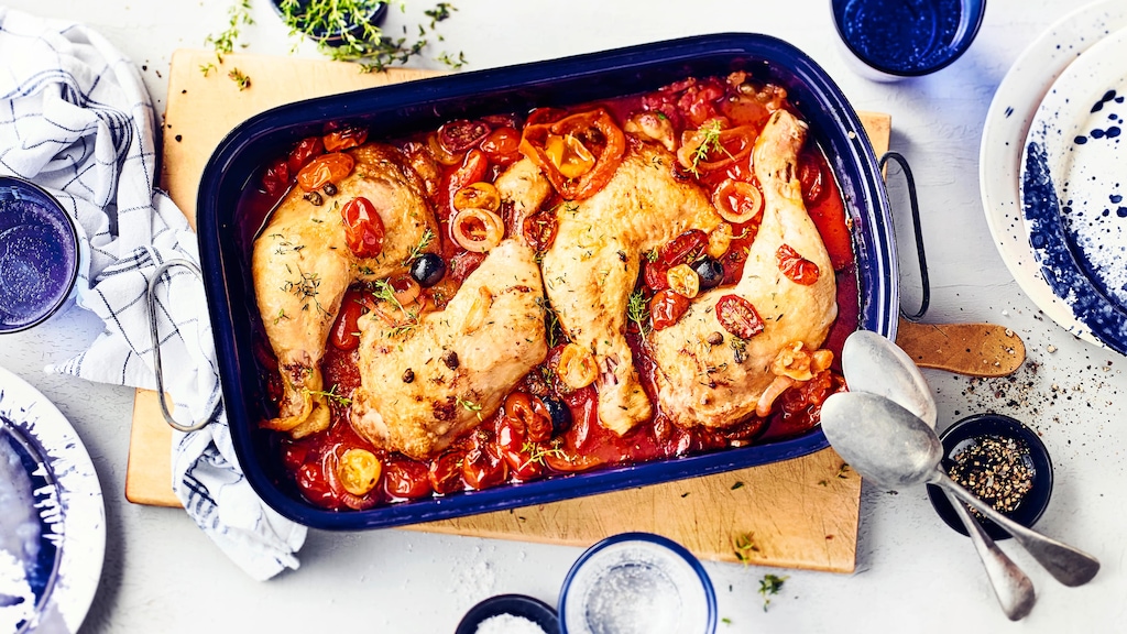 In unserem Rezept wird aus den Tomaten im Backofen eine sämige, fruchtige Soße, die perfekt mit den Kapern und Oliven harmoniert und das Huhn auf den Teller begleitet. Sie haben aber unzählige Möglichkeiten für Soßen: Statt mediterran können Sie die Keulen mit einer exotischen Curry-Marinade, einer orientalischen Soße aus Chili, Aprikosen, Kreuzkümmel und Thymian oder auf japanische Art mit Teriyaki-Soße zubereiten. Zu diesen Rezepten reichen Sie am besten Reis oder Couscous als Beilage.