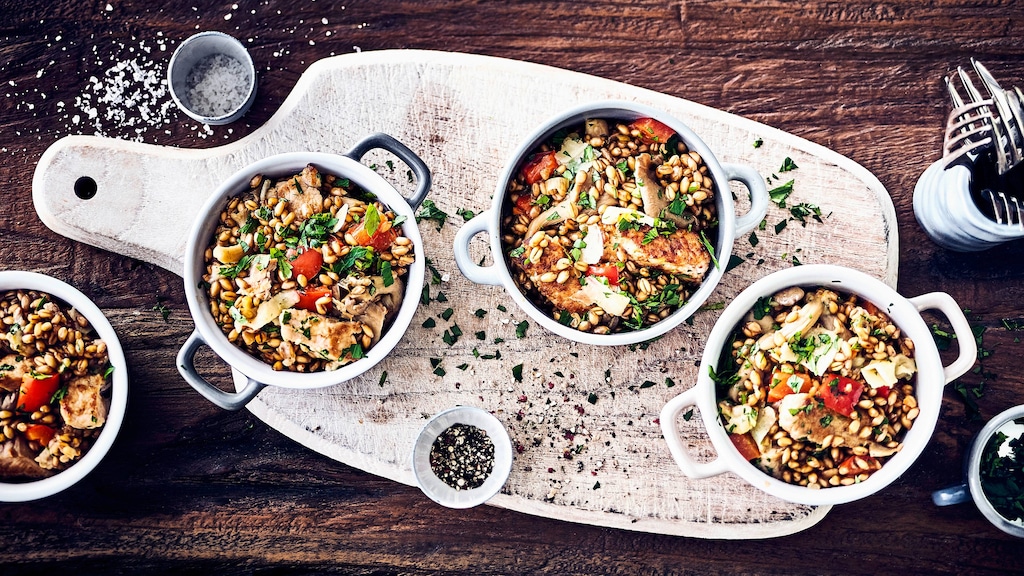 Schnelles Risotto-Mittagsgericht: Zaubern Sie mit unserem Rezept im Nu ein saftiges Schweine-Geschnetzeltes an Weizen-Risotto mit frischen Kräutern und Parmesan!