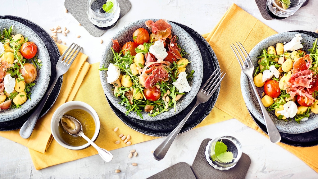 Unser Gnocchisalat nach diesem Rezept hingegen kann auch als Hauptspeise serviert werden: Er wird mit vielen sättigenden Zutaten zubereitet – wie frischen Gnocchi aus dem Kühlregal, feinen Kräuterseitlingen, edlem Serranoschinken und würzigem Ziegenkäse.