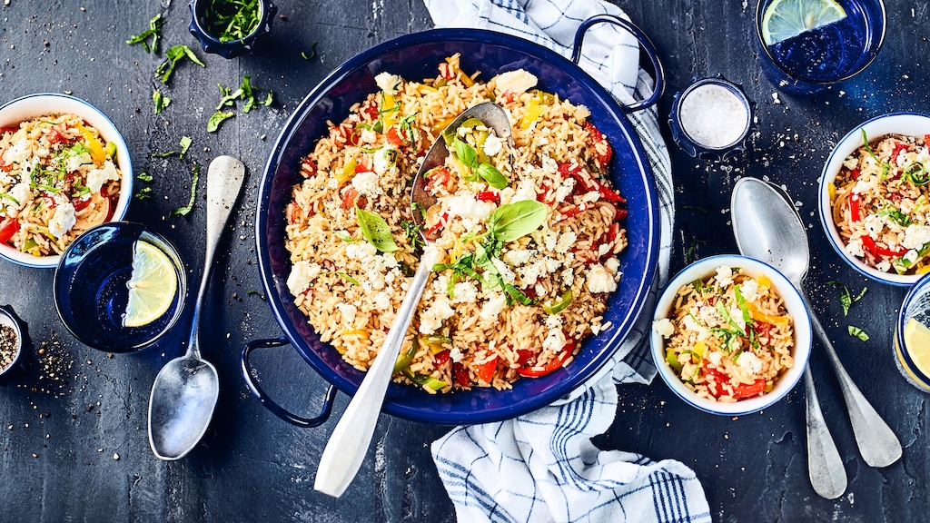 Mit unserem Rezept für eine griechische Reispfanne kochen Sie mit Gemüse, Reis und leckerem Schafskäse ein tolles Hauptgericht für die ganze Familie. Knoblauch, Chili, Oregano, Lorbeer und Thymianblätter sorgen für die gewünschte Würze!