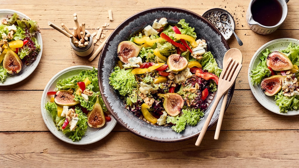 Sommerlich leichter Genuss: Probieren Sie unser Rezept für einen grünen Salat mit Gorgonzola, gebackenen Feigen, Paprika und Walnüssen unbedingt einmal aus!