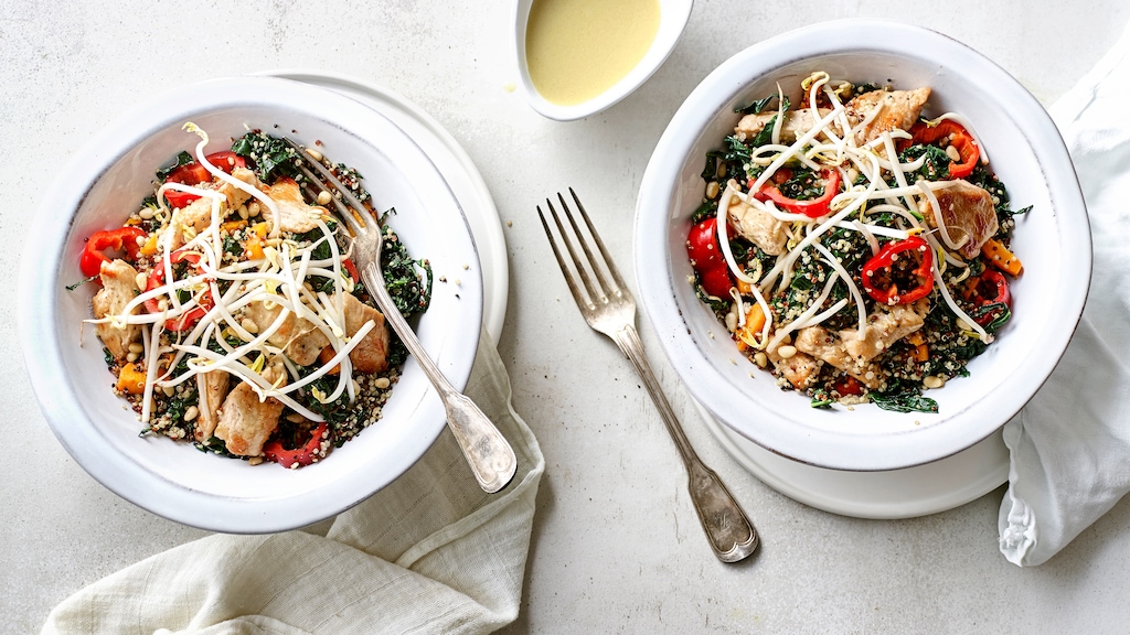 Die Quinoa, den Grünkohl, die Möhren und die Paprika vermengen. In tiefen Tellern anrichten, die Putenstreifen und die Pinienkerne darüber verteilen. Mit Keimlingen garnieren und das Dressing dazu reichen.