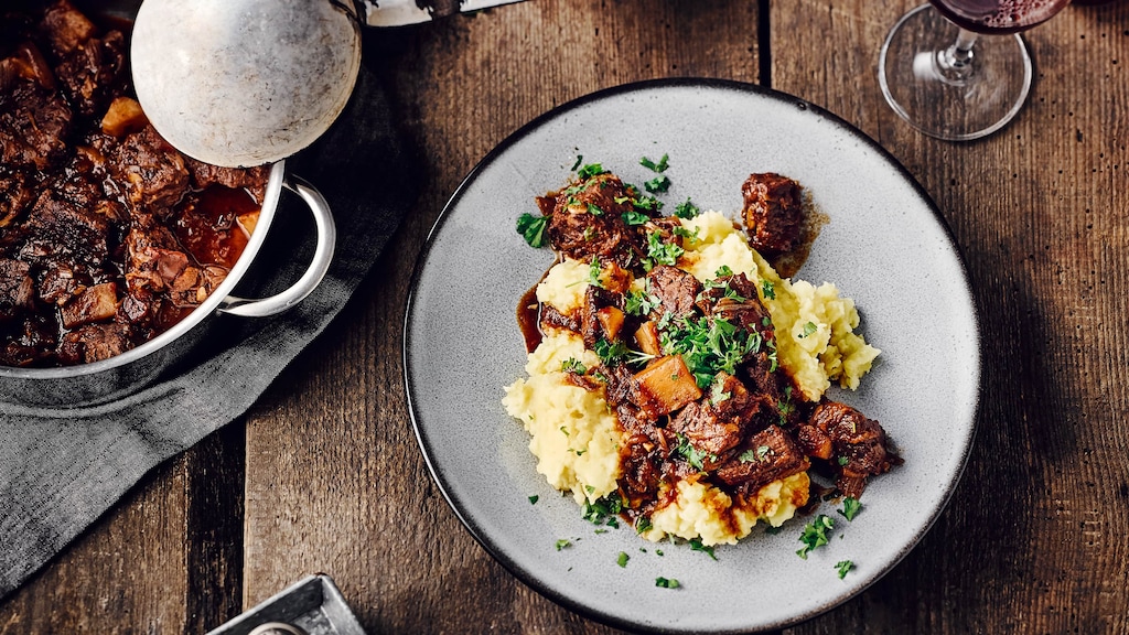 Unser Tipp für ein deftiges Wintergericht: Probieren Sie unser Rindergulasch mit Knollensellerie, würzigen Zwiebeln und getrockneten Aprikosen! Dazu gibt es Kartoffelpüree mit Apfel.