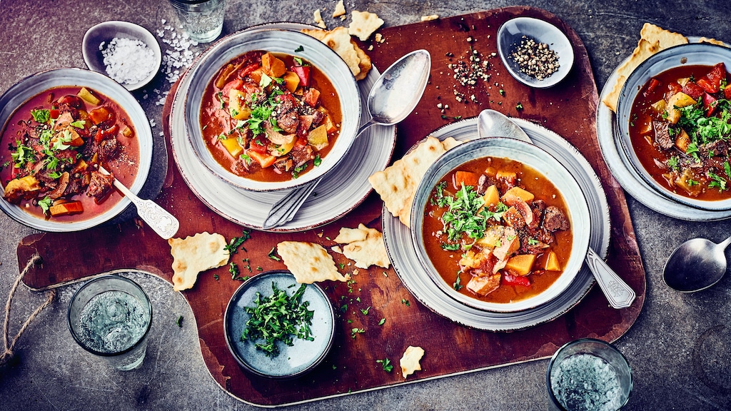 Der Klassiker einmal exotisch: Probieren Sie unsere deftige Gulaschsuppe mit Hokkaido-Kürbis, Paprikaschoten, Chili, Ingwer und Datteln!