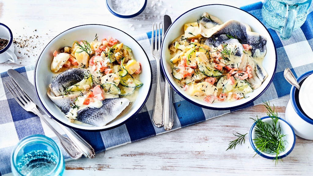 Probieren Sie unsere Variante dieses klassischen Fischgerichts einmal aus: Gurken-Kartoffeln mit Möhre und Dill in einer pikanten Frischkäse-Soße, dazu Bismarck-Hering – fertig in 35 Minuten!
