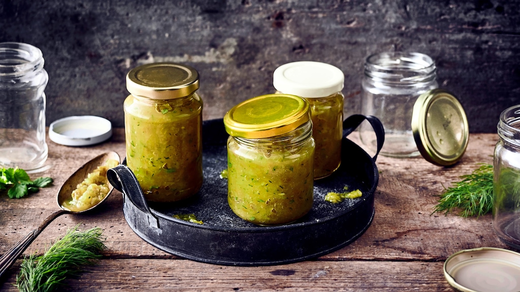 Wie selbst gemachte Fruchtaufstriche oder Chutneys ist auch die Würzsoße nach unserem Gurkenrelish-Rezept im Glas verschlossen für mehrere Monate bis ein Jahr haltbar. Beachten Sie dafür folgende Dinge, wenn Sie Gurkenrelish selber machen: Alle Arbeitsgeräte müssen absolut sauber sein, kochen Sie die Gläser aus (auch die Deckel!), bevor Sie das Relish – am besten kochend heiß – einfüllen. Je weniger Sauerstoff sich in den Gläsern befindet, desto länger ist das Relish haltbar, füllen Sie deshalb die Gefäße bis knapp unter den Rand. Damit die Gläser nicht zerspringen, wärmen Sie sie vor dem Einfüllen mit heißem Wasser auf. Angebrochen hält sich Ihr selbst gemachtes Relish für ein bis zwei Wochen im Kühlschrank. Noch mehr Lust auf Einmachen? Probieren Sie auch einmal unser Mixed-Pickles-Rezept!