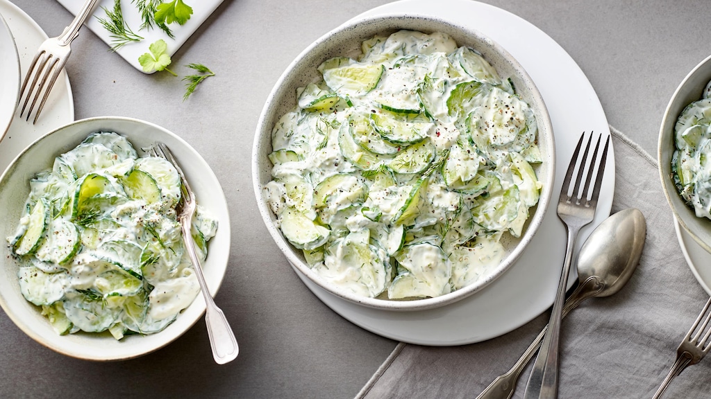 Dill und Gurken haben schon immer bestens zusammengepasst. Nicht umsonst finden Sie seine herbe Süße und das charakteristische Aroma häufig in den unterschiedlichsten Gurkensalat-Rezepten. Wichtig ist, dass Sie den Dill immer kalt dazugeben und nicht mitkochen. Sonst verliert er sein Aroma. Entsprechend mischen Sie das Kraut, das übrigens mit dem Fenchel verwandt ist, erst spät unter, wenn Sie unser Rezept für Gurkengemüse ausprobieren. Vorher achten Sie darauf, wirklich nur niedrige Hitze zu verwenden. Sonst entzieht die Zubereitung in der Pfanne dem Gericht zu viel Wasser. Schmorgurken macht das weniger aus, nur verwenden Sie für unser Gurkengemüse Salatgurken. Garen Sie die zu heiß und zu lang, verlieren sie angesichts des für sie essenziellen hohen Wassergehalts an Biss – und fallen in sich zusammen. Folgen Sie unserer Anleitung, nimmt das Kürbisgewächs stattdessen die Aromen von Zwiebeln und Knoblauch auf. Beide ergänzen die Frische und dezente Bitternote der Gurke hervorragend. Und am Ende passt alles wunderbar zum Joghurt-Dressing unseres Gurkengemüses!