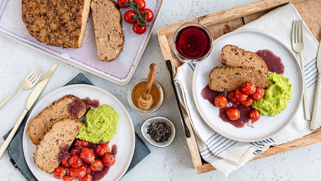 Saftiger Hackbraten aus dem Ofen mit Erbsenpüree, Ofentomaten und Rotweinsoße. Perfekt gewürzt und schonend gebacken für den besten Geschmack. Jetzt das Rezept entdecken!