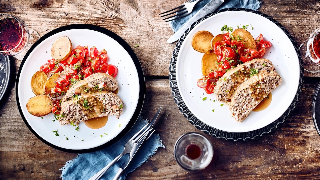 Kann es mit jedem Festtagsmenü aufnehmen: Ein würziger Braten aus gemischtem Hackfleisch mit fein gewürfelten Äpfeln. Dazu Kartoffeln und fein geschmorte Tomaten.