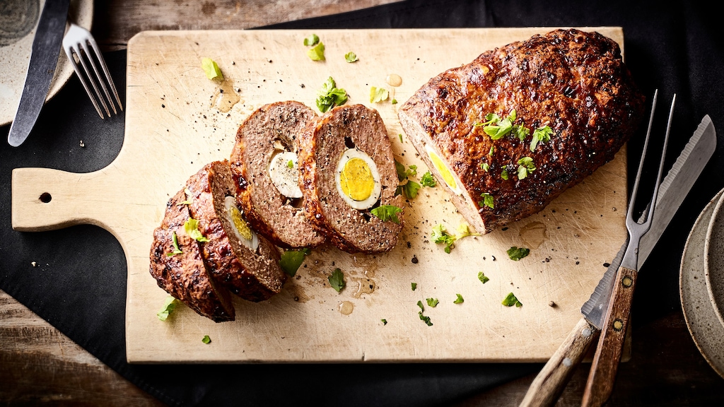 Falscher Hase – unter diesem Namen ist eines der wohl traditionsreichsten deutschen Fleischgerichte bekannt. Statt teurem Kaninchen schob man in vergangener Zeit einen Sonntagsbraten aus Fleischresten in den Ofen und streckte diesen noch mit Brot und Eiern. Was früher aus der Not geboren wurde, landet heute als kulinarisches Highlight auf dem Teller: So wie in unserem Rezept für Hackbraten mit Ei im Backofen.
