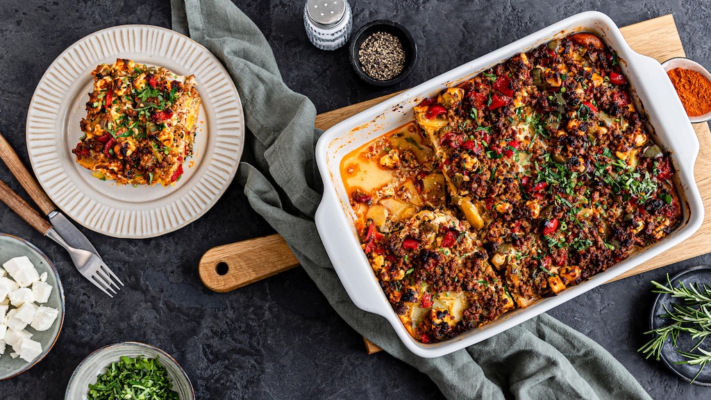 Frisches Hackfleisch trifft auf Paprika, Kartoffeln, Knoblauch und Schafskäse. Die würzige Krönung bildet ein Guss aus Eiern und Sahne, der im Ofen überbacken wird. Mit unserem Hackfleisch-Auflauf-Rezept zaubern Sie ein Gericht für die ganze Familie – lecker, sättigend und herrlich deftig!