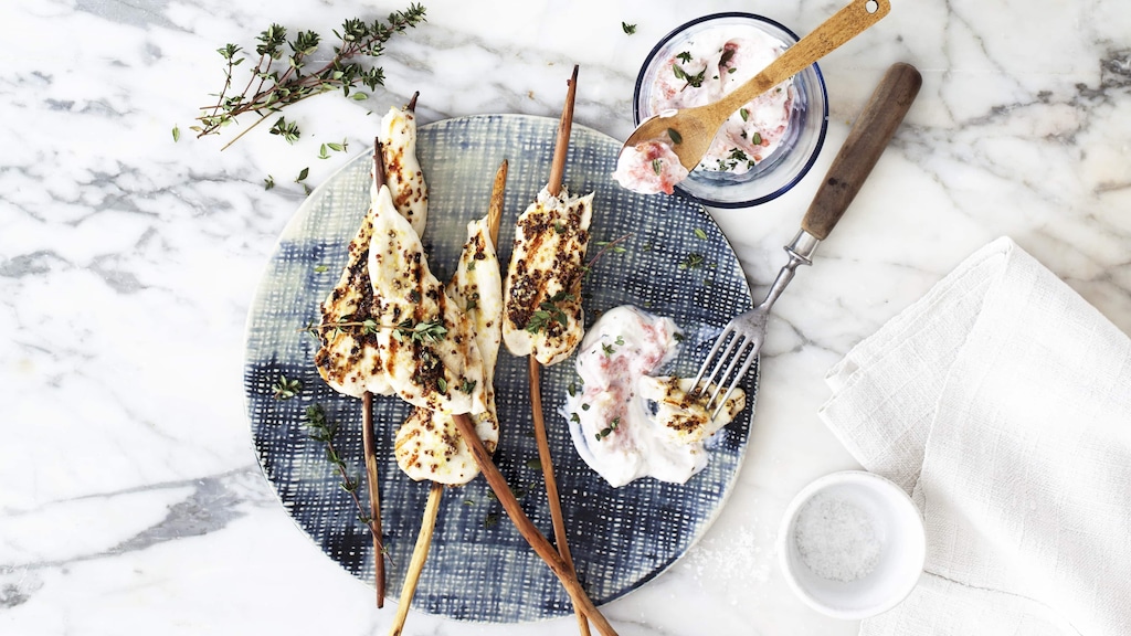 Sticks mit Salz und Pfeffer würzen und auf dem heißen Grill von jeder Seite 2–3 Minuten grillen. Feigenjoghurt dazu reichen.