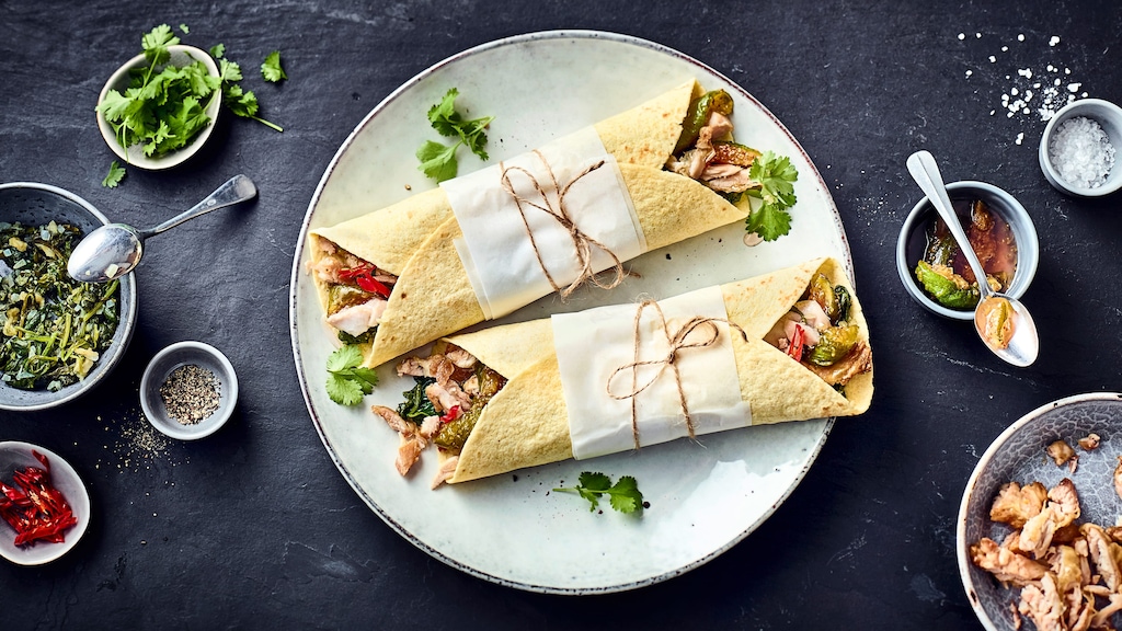 Alle Geschmacksnuancen, vereint in einer Tortilla. Das bekommen Sie mit unserem Hähnchen-Wraps-Rezept. Zu saftiger Hähnchenkeule gesellen sich süß-scharf-säuerliche Feigen sowie eine Füllung aus Ziegenfrischkäse, Zitronen und Spinat.