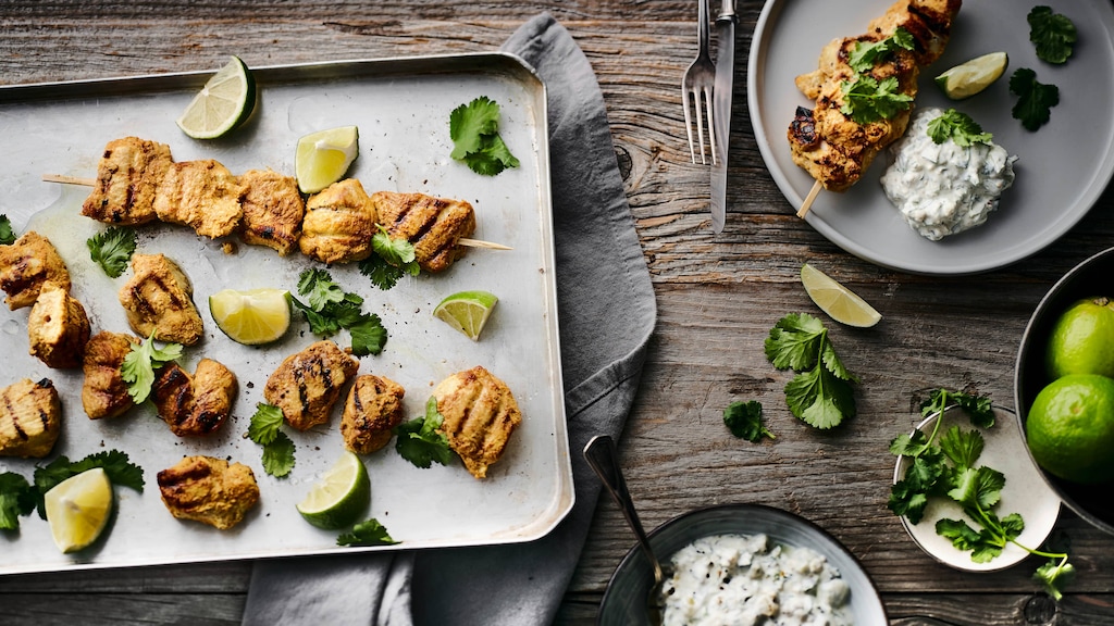 Als Beilage zu unseren gegrillten Hähnchenspießen servieren wir Raita, ein würziger Joghurt-Dip nach indischem Rezept, der mit frischem Koriander, spritziger Minze und saftigen Gurken verfeinert wird – himmlisch! Reichen Sie Knoblauch-Naan dazu, um den Dip aufzunehmen. Eine Dessert-Empfehlung zu unserem Geflügel-Rezept ist unsere gegrillte Ananas, denn Hähnchenfleisch und Ananas – das passt einfach!