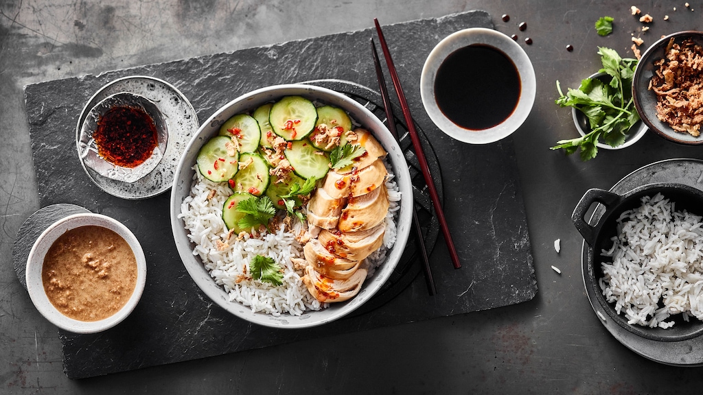 Hainan Chicken kommt ursprünglich aus der chinesischen Provinz Hainan und wurde von Einwanderern nach Singapur, Malaysia und andere südostasiatische Länder mitgebracht. Dort etablierte sich das Gericht in Garküchen und Restaurants schnell als Standard. Besonders am Hühnchenreis sind das zarte, saftige Fleisch, die exotischen Gewürze und der Reis. Letzterer gart nach der Reis-Quellmethode in der Hühnerbrühe und entwickelt dadurch einen besonders intensiven Geschmack. Dank dieser Kochmethode nimmt die beliebte Beilage die gesamte Flüssigkeit und somit alle enthaltenen Aromen auf. Auch andere Rezepte profitieren davon: Beim malaysischen Frühstück Nasi Lemak etwa zieht der Jasminreis in Kokosmilch durch – das sollten Sie ebenfalls einmal probieren!