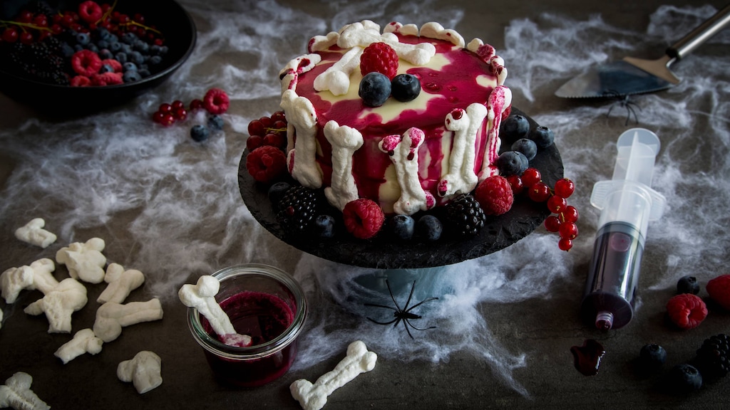 Keine Lust auf klassische Skelett-Deko für die Halloween-Party? Kein Problem: Wir verzieren einfach unsere beerenstarke Torte mit Baiser-Knochen. Und bringen so kleine und große Geister zum Staunen. Vorhang auf für unsere Halloween-Torte.