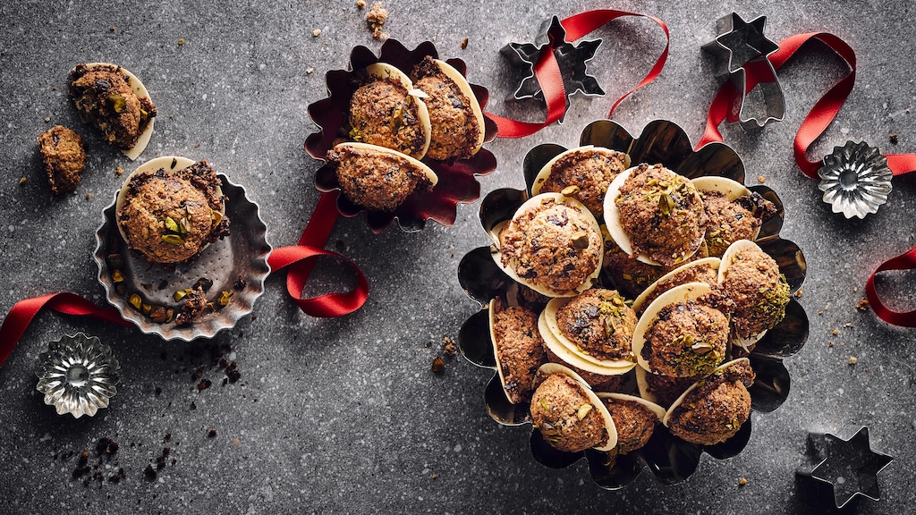 Unser Haselnusskekse-Rezept eignet sich gut für die Zubereitung von köstlichem Adventsgebäck. Mit Nüssen und getrockneten Cranberrys werden typische winterliche Zutaten verwendet. Die fein säuerlichen Fruchtnoten der Beeren und die Süße der dunklen Schokolade geben den Plätzchen das gewünschte Aroma. Anders als die für die Weihnachtszeit typischen buttrigen Mürbeteigkekse enthält unser festliches Gebäck zarte Haferflocken und gehackte Pistazien – das verleiht ihm mehr Biss. Damit die Haselnussplätzchen nicht zerbröseln, setzen Sie den Teig vor dem Backen auf feine Oblaten. In unserem Haselnusskekse-Rezept sind nur 70 Gramm Mehl aufgeführt, daher ist das Gebäck sehr saftig. Unser Rezept für klassische Kokosmakronen kommt sogar ganz ohne Mehl im Teig aus. Tipp: Bewahren Sie die Kekse am besten in einer verschließbaren Metall- oder Kunststoffbox getrennt von anderen Gebäcksorten auf – so bewahren die Plätzchen ihr Aroma und bleiben lange frisch.