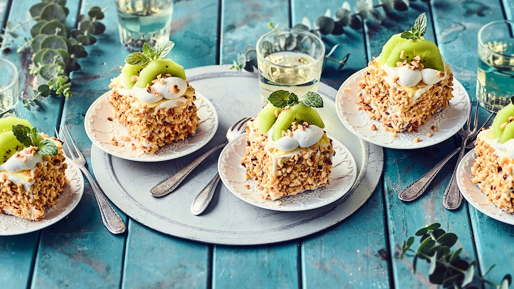 Zum nachmittäglichen Kaffee am Sonntag darf der Kuchen nicht fehlen – mit unserem Kiwitorten-Rezept liefern wir Ihnen eine passende Idee für warme Sommertage. Die kleinen Törtchen basieren auf einem lockeren Biskuitteig mit Nuss-Nougat-Creme und werden mit einer Füllung aus pürierter Passionsfrucht, Joghurt, Sahne und Eiweiß versehen. Garniert mit gehackten Haselnüssen, Kiwi-Scheiben und Melisseblättern wird der Augenschmaus perfekt.