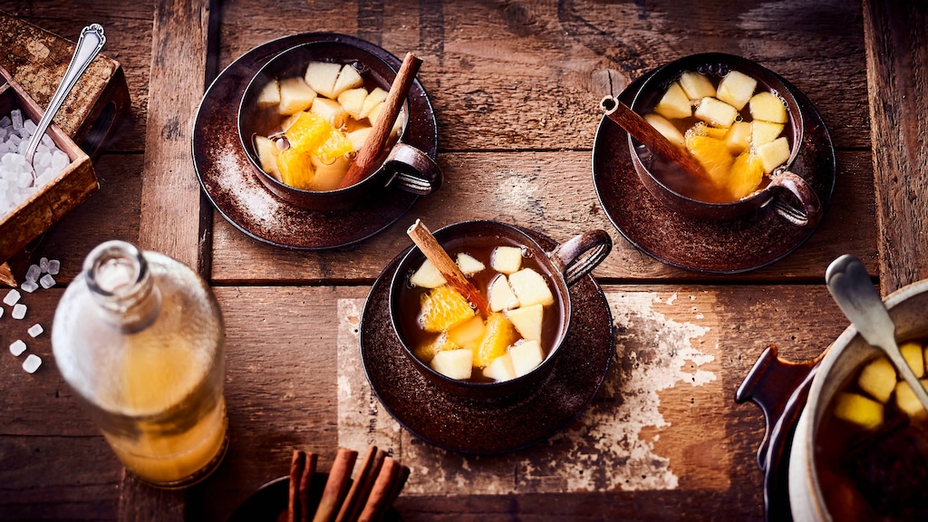 Perfekt für die kalte Jahreszeit – Unser Rezept für Heiße Apfelbowle aromatisiert mit Calvados, Gewürzen und fruchtigen Apfel- und Orangenwürfel.