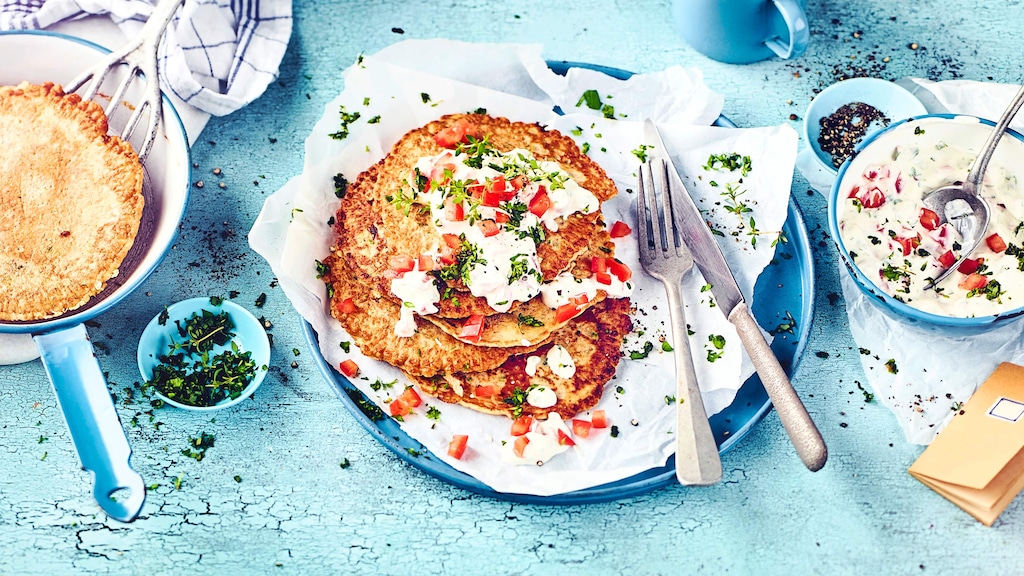 Süße Pfannkuchen gehören zu den beliebtesten Eierspeisen – dabei schmecken die schnell ausgebackenen Pancakes in der deftigen Variante mindestens genauso gut! Zum Beispiel mit einem cremigen Joghurt-Tomaten-Dip: Wie diese Kombination gelingt, zeigt Ihnen unser Rezept für herzhafte Pfannkuchen.