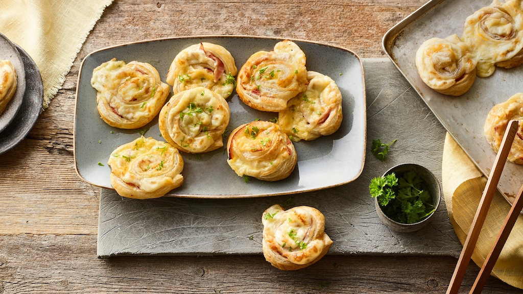 Den Blätterteigschnecken mit Schinken und Käse wird so eine extra cremige Note hinzugefügt und Ihre Gäste werden begeistert sein von den verschiedenen Geschmackserlebnissen.