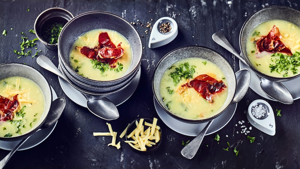 Das Gericht nach unserem Käsesuppen-Rezept lässt sich schnell und einfach zubereiten. Schinkenchips verleihen der Suppe den letzten Schliff und machen sie zu etwas ganz Besonderem.