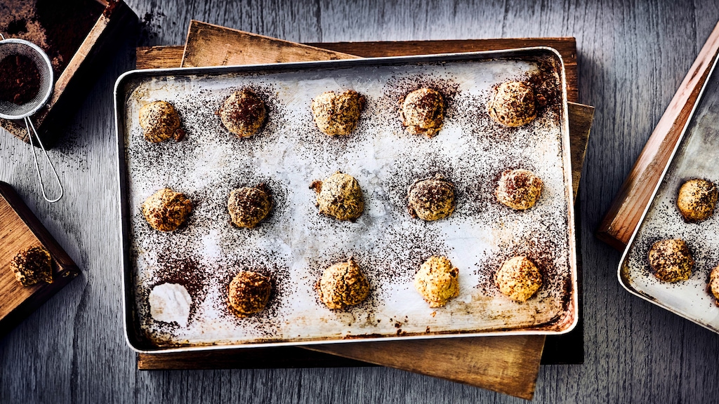 Backofen auf 180 Grad Ober-/Unterhitze vorheizen. Backblech mit Backpapier auskleiden. Teig in teelöffelgroßen Häufchen mit jeweils etwas Abstand auf das Backpapier setzen. Auf der mittleren Schiene 15 Minuten backen. Kekse auf einem Kuchengitter abkühlen lassen und mit Kakao-Pulver bestäuben.