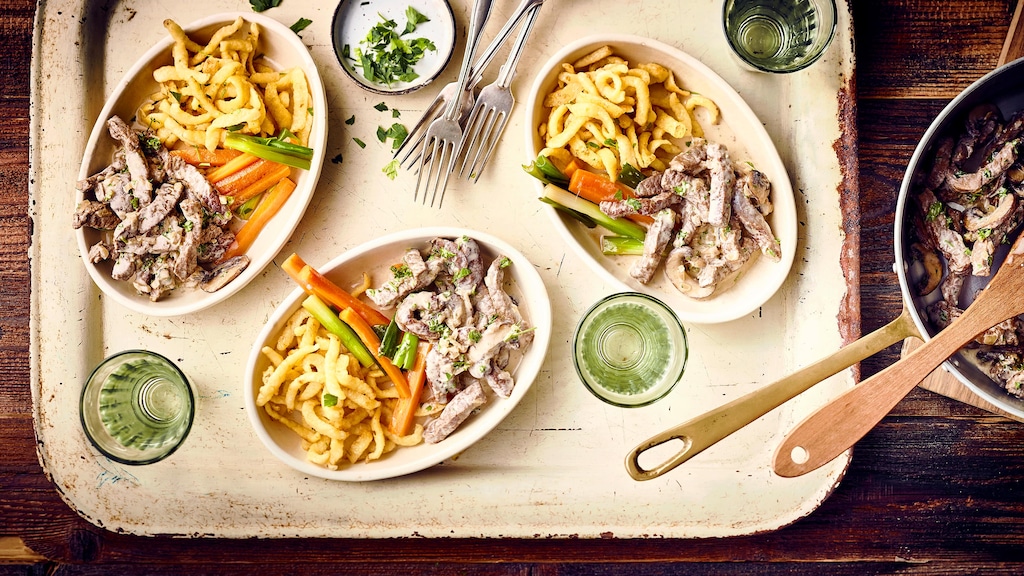 Klassisches Gericht für den Winter: Unser feines Kalbsgeschnetzeltes mit würzigem Karotten-Frühlingszwiebelgemüse aus der Pfanne und Spätzle!