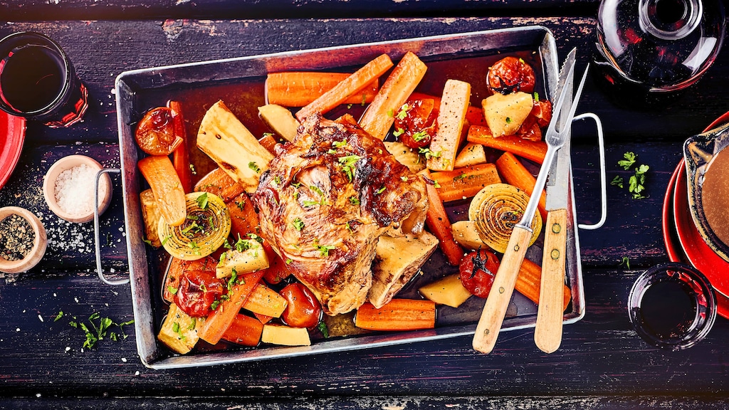 Wir servieren Ihnen heute köstliche Kalbshaxe mit frischem Schmorgemüse – schön saftig und mit Petersilie bestreut ein wahres Gedicht.