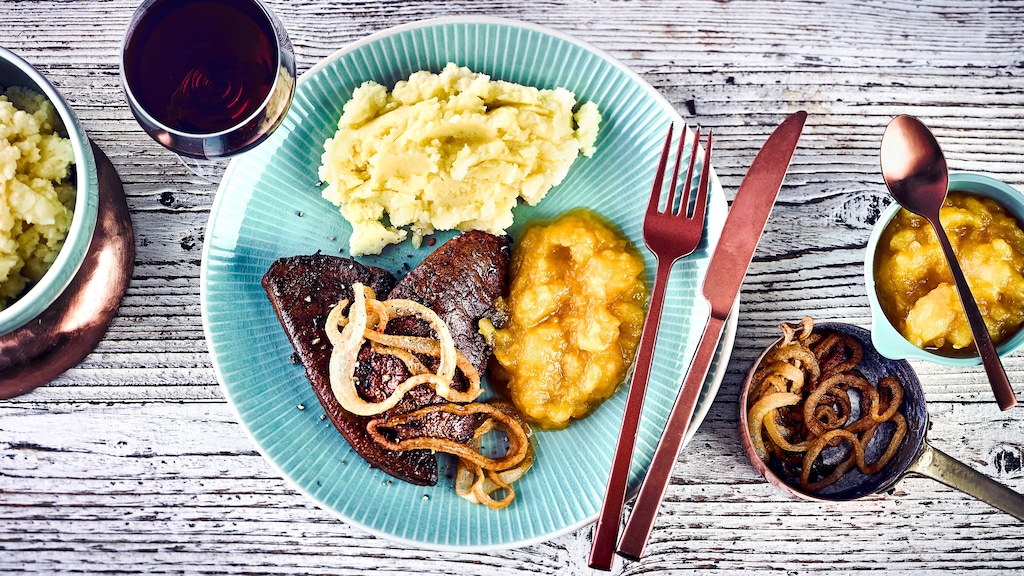 Die Leber mit Kartoffelpüree, Zwiebeln und Apfelmus servieren.