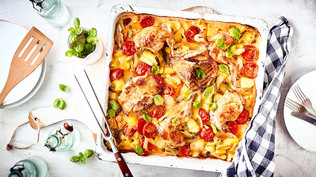 Zwiebeln in 4 cm lange Abschnitte schneiden und die letzten 2 Minuten mitbraten. Milch mit Maismehl und Thymian erhitzen. Das Gemisch unter die Kartoffeln heben. Mit Pfeffer und Salz abschmecken. Die Zutaten auf dem Backblech verteilen. Die Kaninchenteile über die Kartoffeln legen, Tomaten halbieren, salzen und über dem Fleisch verteilen. 50 Minuten bei 160 Grad (Umluft) schonend garen. Backofentür öffnen und kurze Zeit nachziehen lassen. Mit Basilikum bestreut servieren.