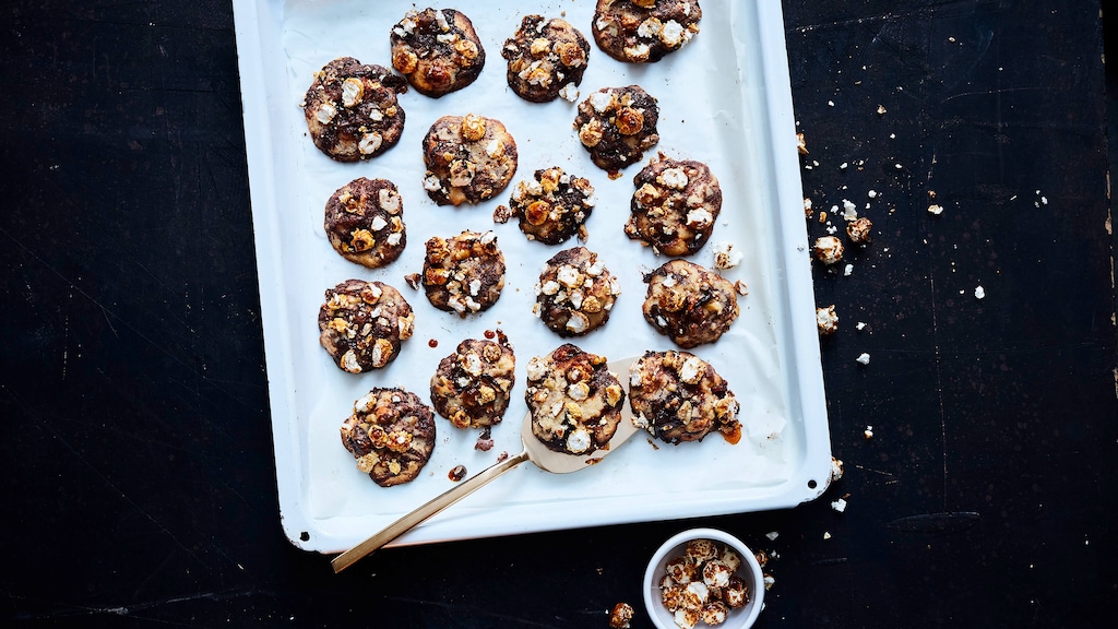 Köstliche Walnuss-Cookies mit Zartbitterschokolade: Unser selbstgemachtes Karamell-Popcorn verleiht den Cookies den letzten Schliff!